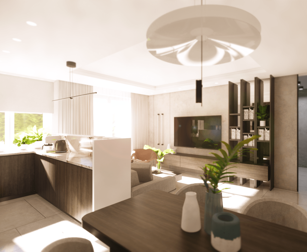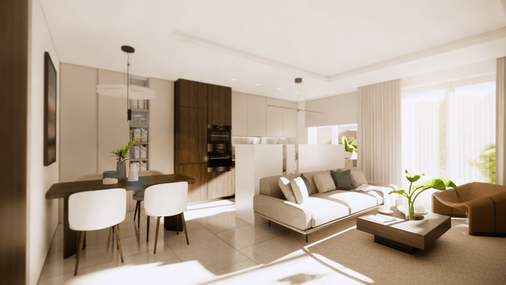 Wyzwaniem projektowym było zmieszczenie w niezbyt dużej przestrzeni trzech funkcji – kuchni, jadalni oraz salonu.