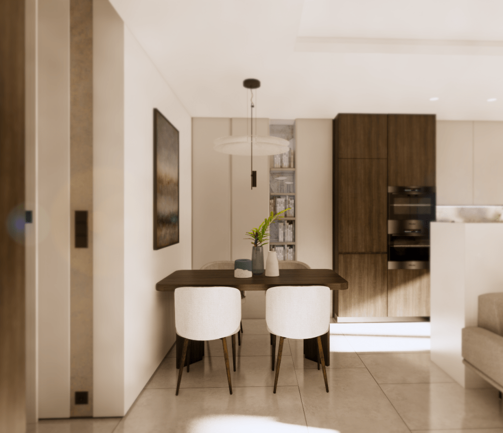 Inwestorom zależało na ciepłym klimacie wnętrza stąd pojawiły się kolory ziemi, ciemne drewno, spiek na ścianie w ciepłym odcieniu i złamana biel w kolorystyce frontów.
