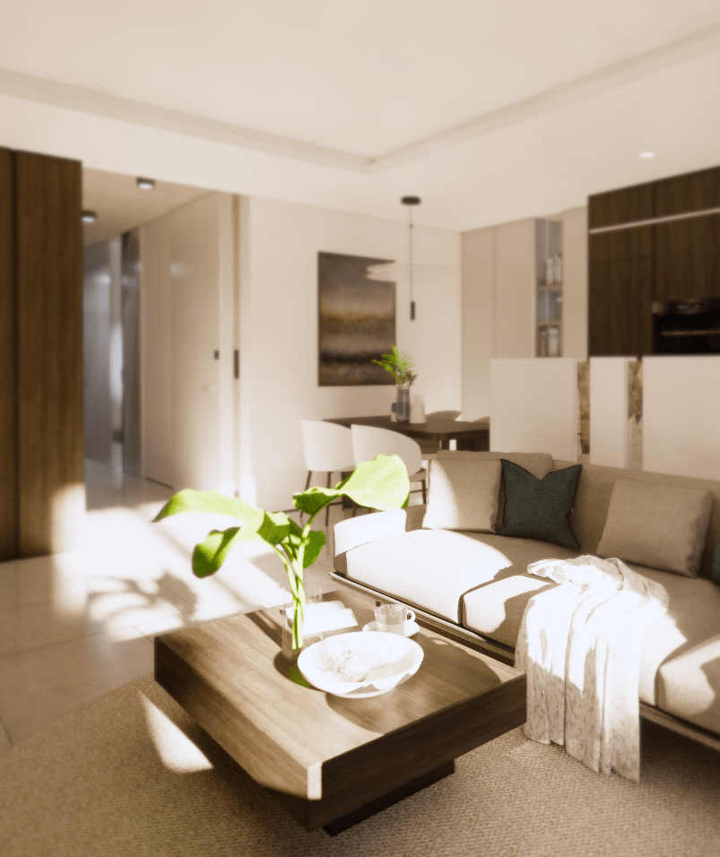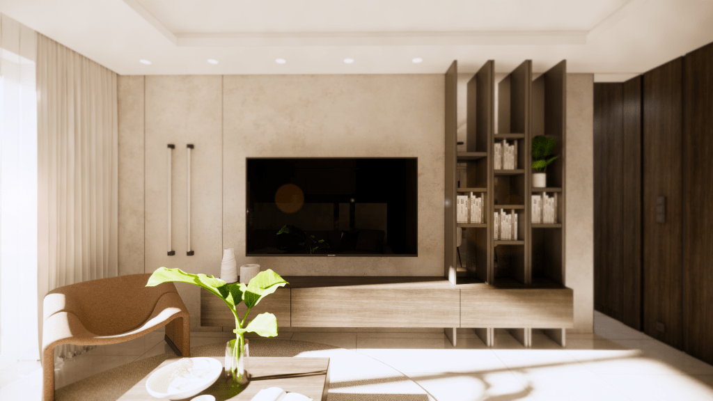 Drugim ważnym punktem przestrzeni jest miejsce wypoczynku – duża wygodna sofa na wprost ściany telewizyjnej z zabudową podświetlaną prostymi kinkietami i ledem pod szafką rtv. Przestrzeń powiększają lustra znajdujące się na placach regału.