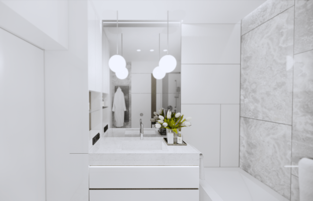 Łazienka w mieszkaniu dla 4 osobowej rodziny. Inwestor chciał aby w pomieszczeniu znalazła się wanna z funkcją prysznica, wygodna umywalka i miejsce do przechowywania. Dzięki przedłużeniu zabudowy stelaża wc udało się zmieścić ukryte półki na kosmetyki. Pod szeroką umywalką znajdują się dwie pojemne szuflady na ręczniki i kosmetyki a w szafce obok lustra można umieścić podręczne akcesoria. Oświetlenie na wysokości twarzy zapewnia odpowiednie światło do robienia makijażu.