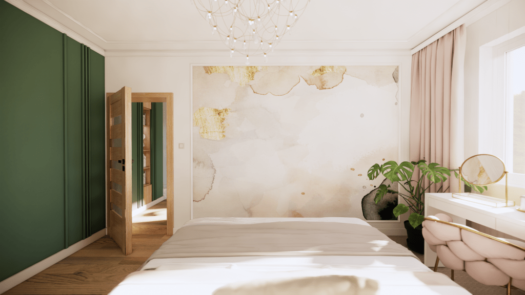 Sypialnia dla młodej pary lubiącej nowoczesne wnętrza z klasyczną dekoracją. Mocny, zielony kolor powtórzony również w pozostałych przestrzeniach domu miał nadać przestrzeni wyraźny i zdefiniowany charakter. Pojawiająca się na ścianach i suficie sztukateria dodaje wnętrzu elegancji i przytulności. Uzupełnieniem dekoracji jest delikatna tapeta na wprost łóżka.