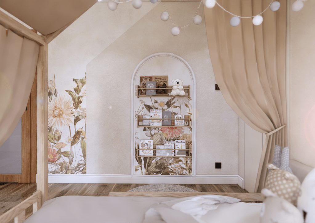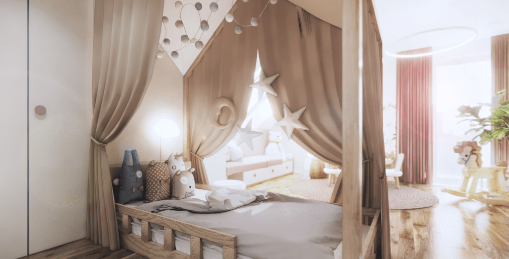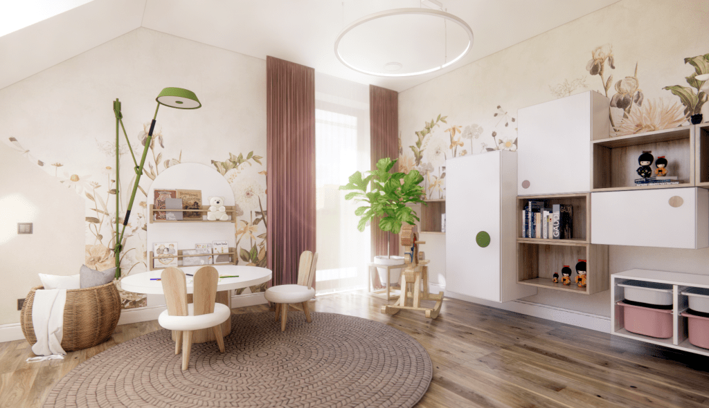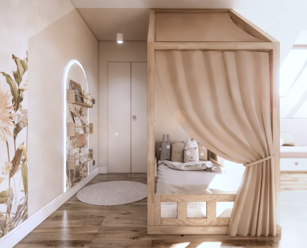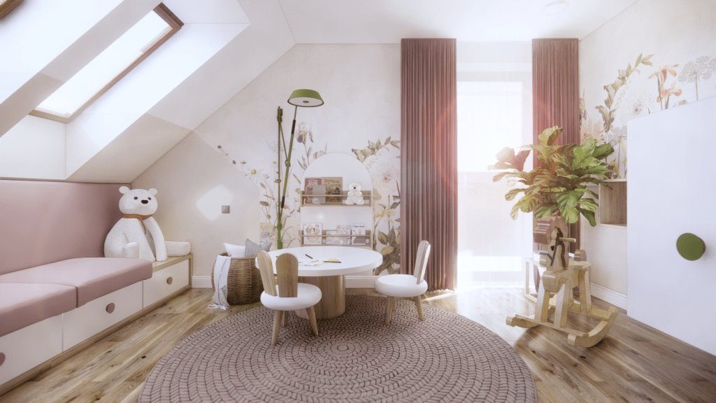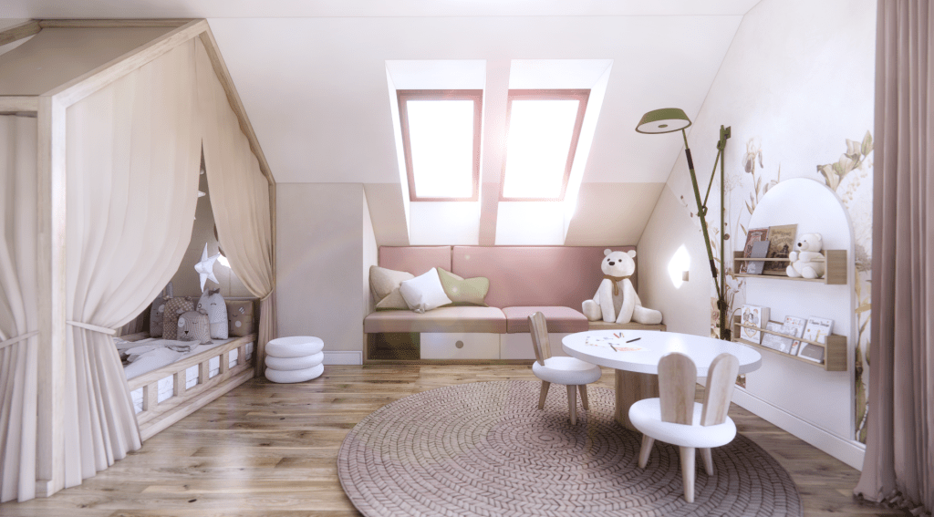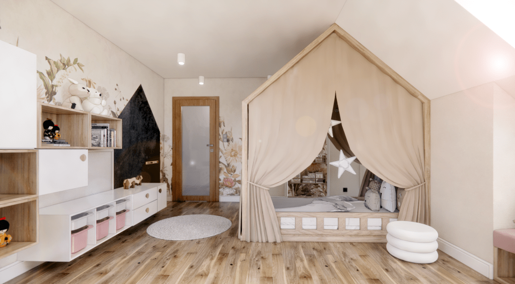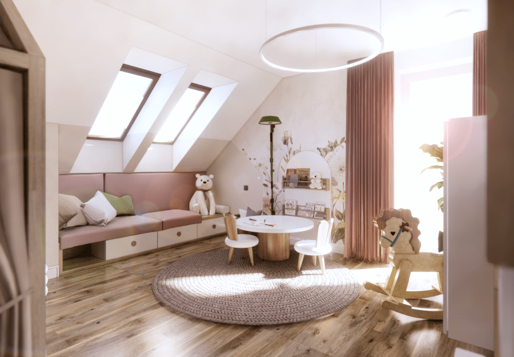 Duża sypialnia z oddzielną garderobą (20m²) została podzielona na dwie strefy – spokojną przestrzeń do snu oraz funkcjonalne miejsce do zabawy. Wyzwania, takie jak nieregularny kształt pokoju, ciemniejszy zakątek przy drzwiach, skosy oraz okna dachowe, zostały rozwiązane poprzez odpowiednie rozmieszczenie mebli. Łóżeczko umieszczono w najciemniejszej części pokoju, blisko wejścia, gdzie baldachim ukrywa skos sufitu, a zasłony zaciemniające zapewniają komfortowy sen. W strefie zabawy znalazły się niskie szafki, mobilny stolik i siedzisko z szufladami, a centralna część pokoju pozostaje pusta, dając dziecku przestrzeń do kreatywnej aktywności.