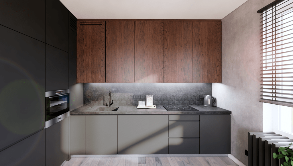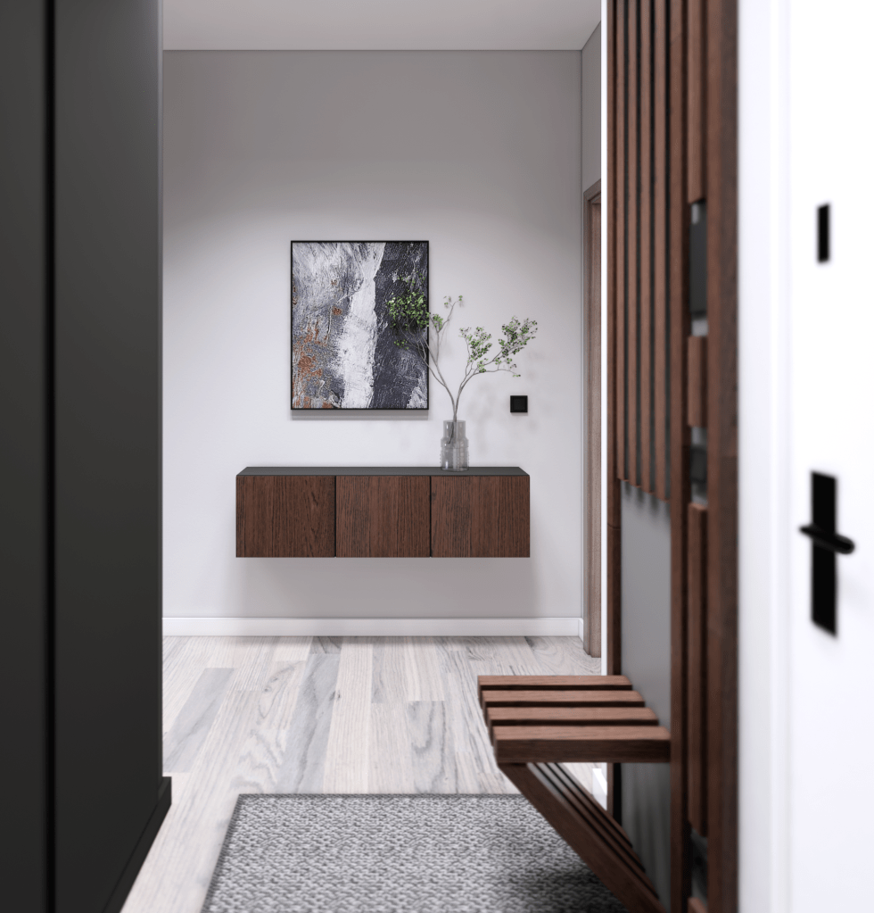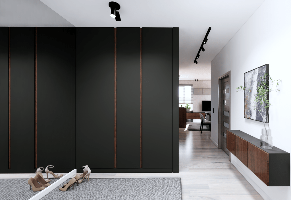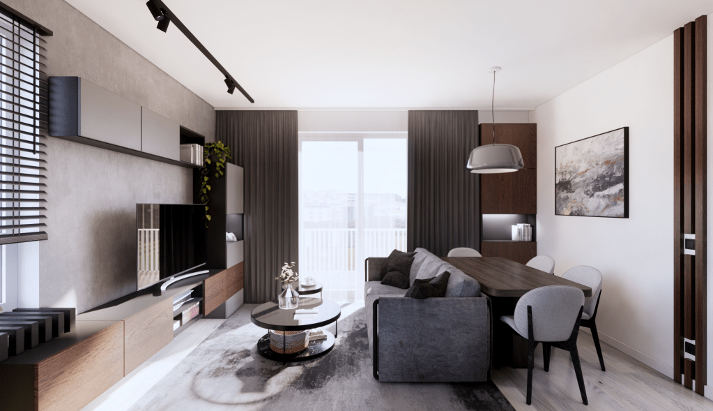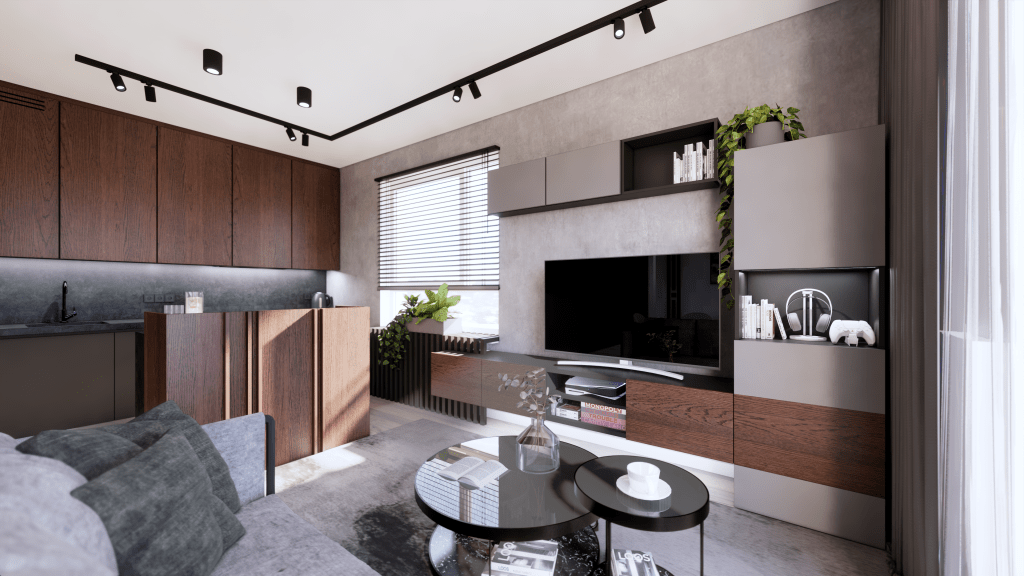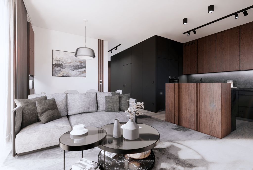 Inwestorom zależało na prostym i współczesnym designie. Chcieli aby do wystroju przemycić surowe materiały i elementy loftowe, zachowując przy tym ciepły, domowy klimat. Odpowiedzią na te potrzeby było zaprojektowanie betonowej ściany za zabudową telewizyjną, dodanie technicznego oświetlenia i mocnego koloru – grafitu. Całość została zrównoważona wprowadzeniem dębu dymionego we frontach zabudów i detalach.