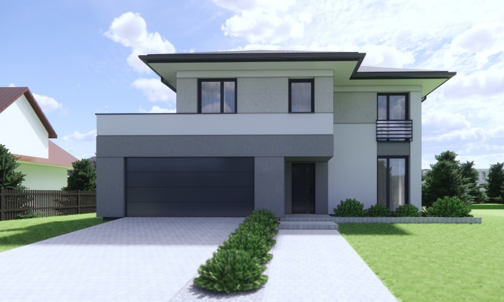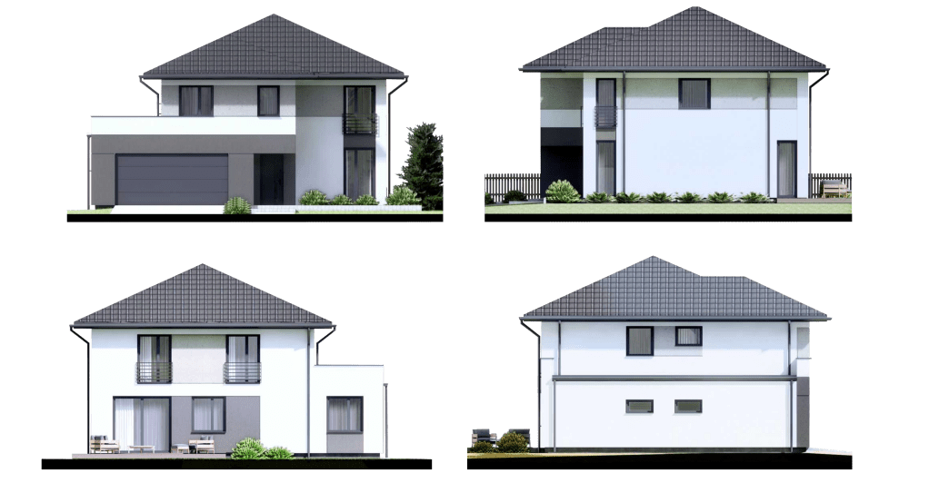 Pierwotny projekt elewacji zakładał użycie wielu materiałów, takich jak drewno, tynk w kilku odcieniach oraz liczne ozdobne detale. Takie rozwiązanie było przytłaczające i nie przypadło do gustu inwestorom. Klienci poprosili o propozycję spokojniejszego i bardziej minimalistycznego wyglądu, który jednocześnie będzie elegancki i ponadczasowy. Zależało im na nowoczesnym charakterze domu dlatego wybrano stonowaną kolorystykę. Dominującą barwą stał się antracyt, który idealnie współgra z ramami okiennymi oraz bramą garażową. Dzięki temu elewacja zyskała spójny i nowoczesny wygląd, zachowując przy tym prostotę i elegancję, której oczekiwali właściciele.