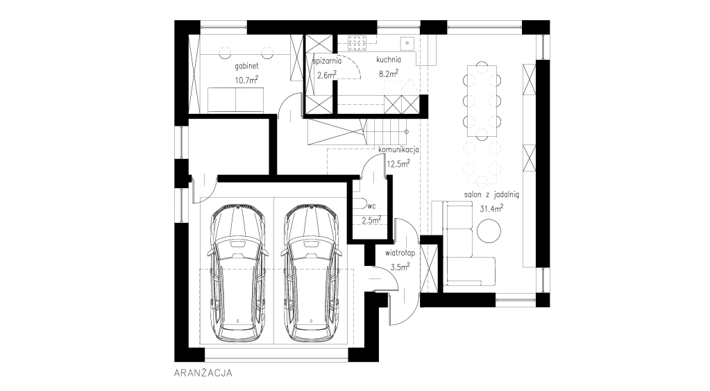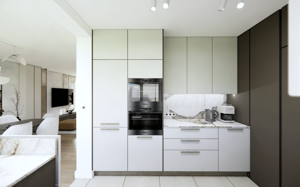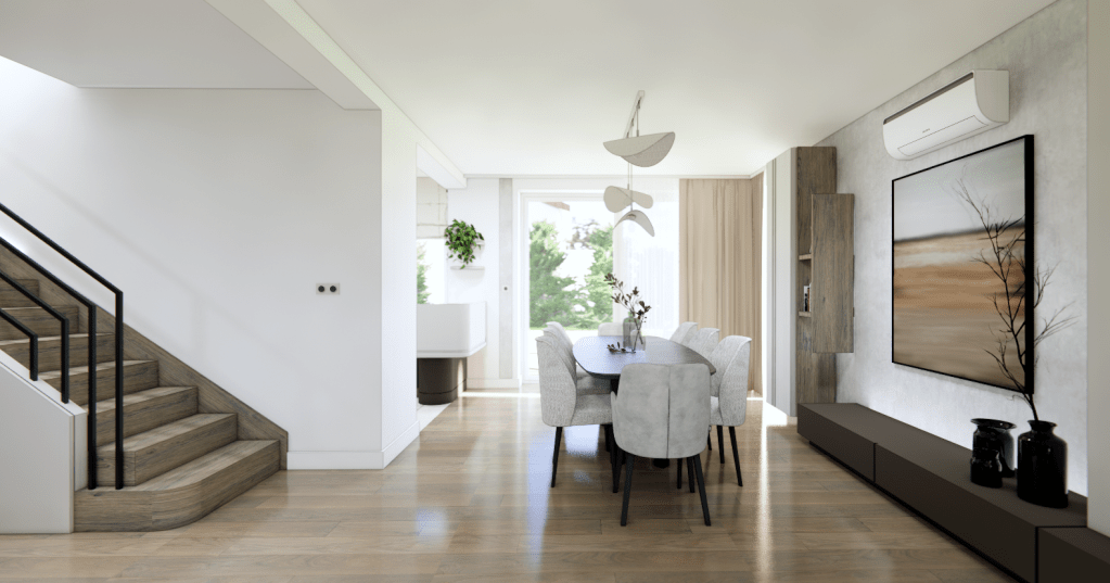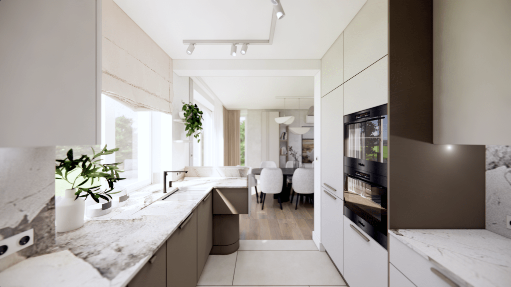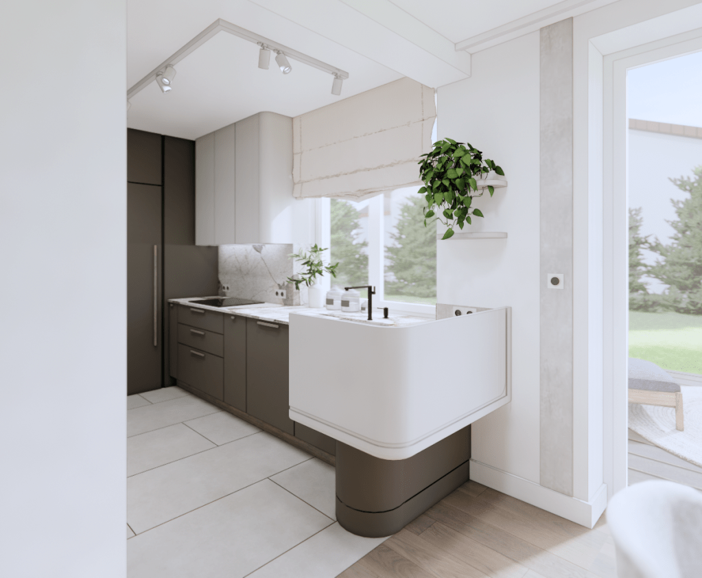 Kontrast dla jasnych płaszczyzn stanowi ciemny brąz, który pojawia się w meblach i detalach. Dzięki tej kolorystyce wnętrze zyskało ciepły, domowy klimat. Całość jest funkcjonalna, a zarazem estetyczna, tworząc przestrzeń idealną do codziennego życia rodzinnego.