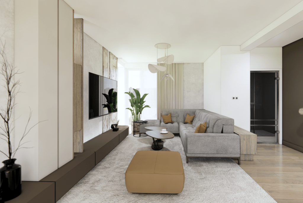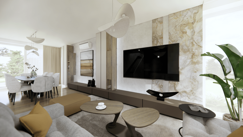 Klienci marzyli o jasnym, ponadczasowym wnętrzu, które będzie dobrym miejscem dla relaksu i spotkań towarzyskich. Chcieli, aby projekt był prosty i nowoczesny ale przy tym również przytulny. Ważne były naturalne materiały i kolory ziemi. Odpowiedzią na te potrzeby było wprowadzenie drewna zarówno na podłodze jak i na meblach oraz dodanie akcentu z forniru kamiennego, który zdobi ściany dodając wnętrzu elegancji. Natomiast mikrocement na ścianie telewizyjnej podkreśla nowoczesny charakter przestrzeni.