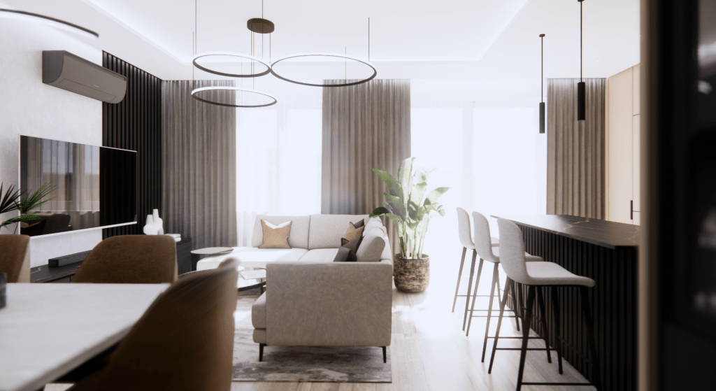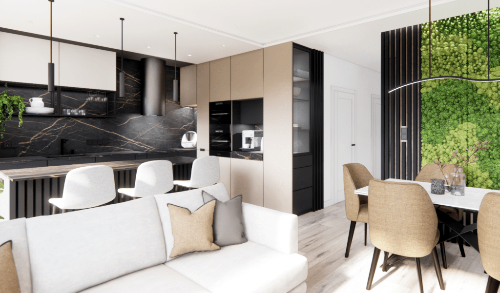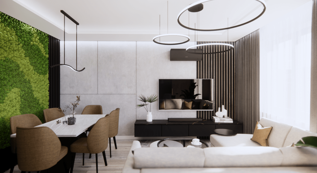 Ściana telewizyjna, wykończona betonem, stanowi bardziej stonowane tło, a kontrastującym, dynamicznym akcentem jest duża, zielona ściana z mchu stabilizowanego. W połączeniu z drewnianą podłogą wprowadza ona do wnętrza przytulność i naturalną harmonię. Mimo zastosowania ciemniejszych tonów, przestrzeń pozostaje jasna i przestronna dzięki dużym oknom oraz sofie w subtelnym, jasnoszarym odcieniu.