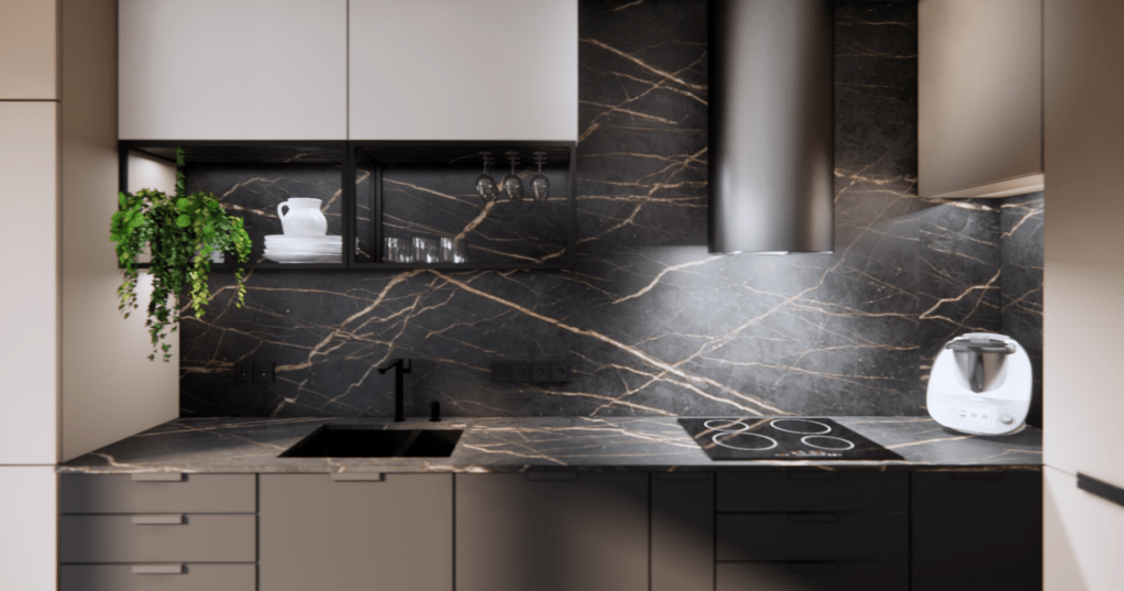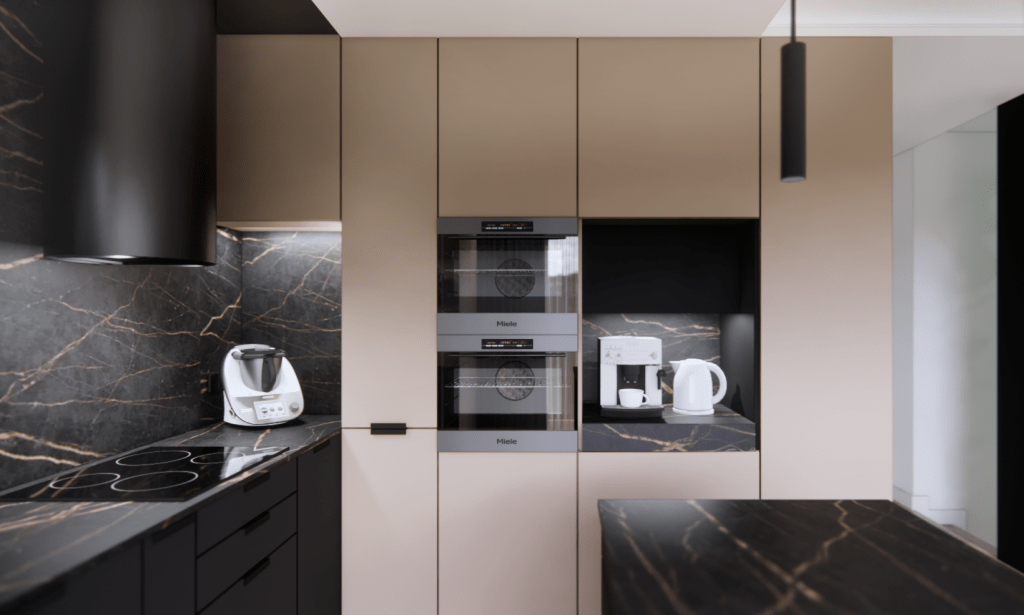 Projekt odchodzi od klasycznych, jasnych aranżacji na rzecz wyrazistych kolorów i materiałów. Ciepłe odcienie frontów kuchennych, wykończonych płytą o metalicznym, miedzianym efekcie, łączą się z głęboką czernią i ciemnobrązowym kamiennym blatem, tworząc nieszablonowy i wyrazisty charakter wnętrza. Strefa wypoczynkowa to duży, rozkładany narożnik oraz przestronny stół, przy którym domownicy mogą wspólnie spędzać czas.