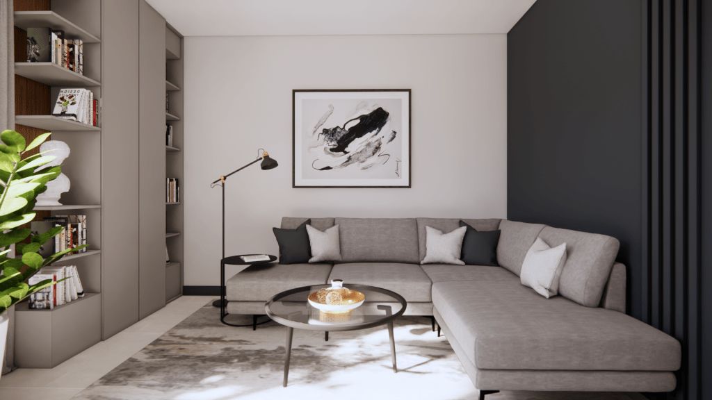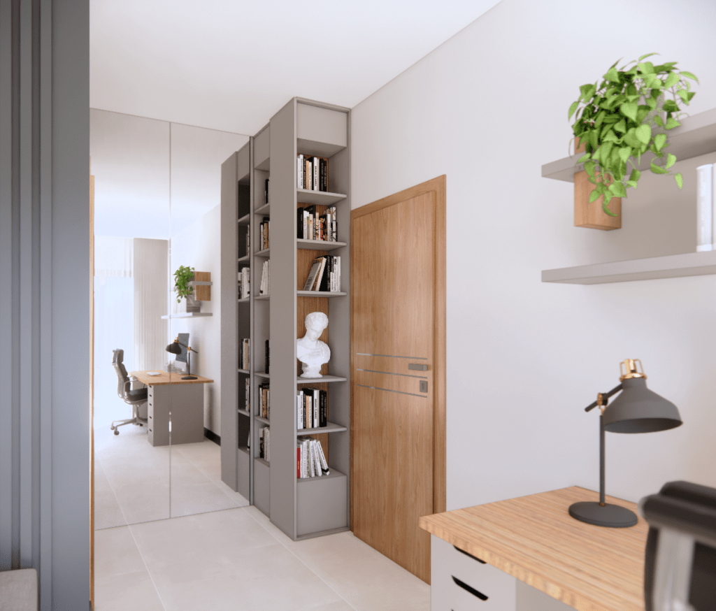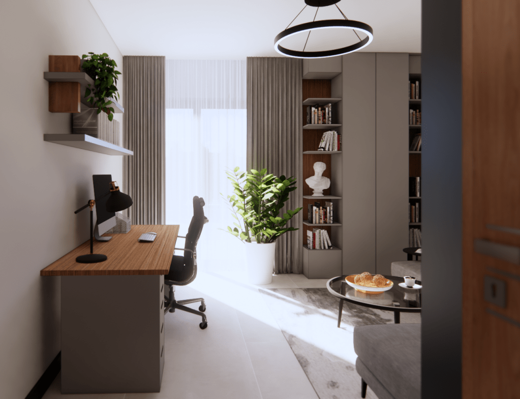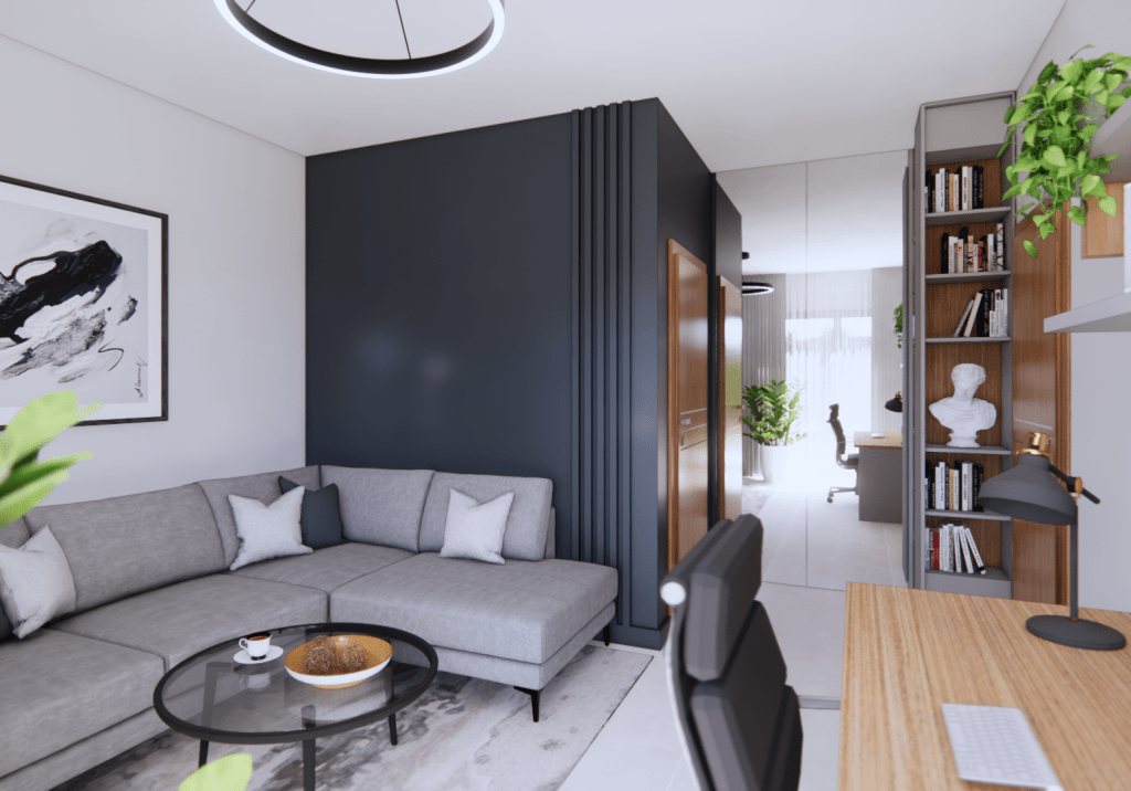 Domowy gabinet, w którym praca zdalna to czysta przyjemność. Króluje tu granat, szarość i ciepłe drewno – kolory, które dodają energii i pomagają się skupić. Spore biurko, regały na książki, wygodny narożnik do relaksu (albo awaryjnego spania) – wszystko na swoim miejscu.