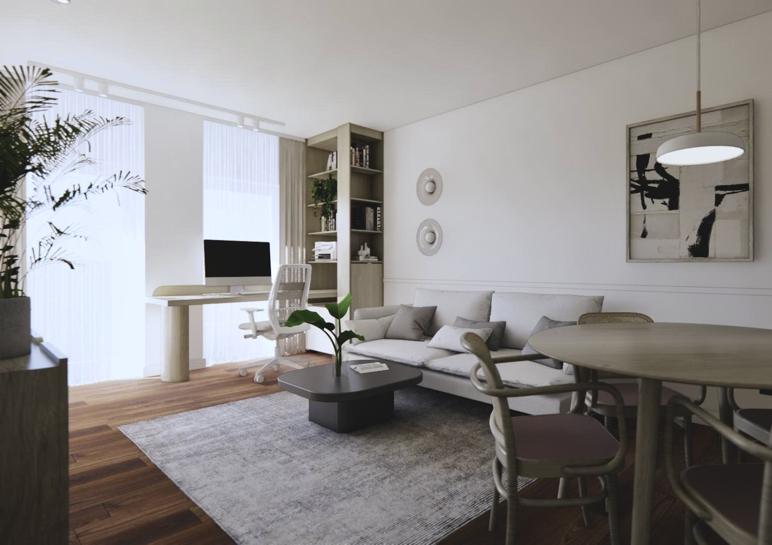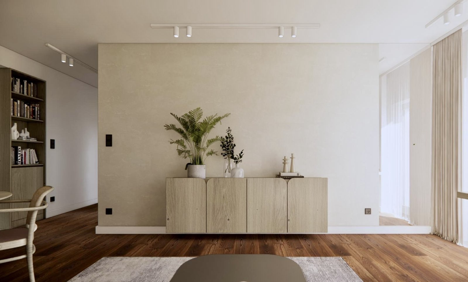 Przestrzeń dzienna pełni kilka funkcji, ale dzięki spójnej kolorystyce, powtarzalnym materiałom, zastosowaniu lustra i ograniczeniu dekoracji zachowuje spokojny, przytulny charakter. Całość tworzy wnętrze minimalistyczne, ale ciepłe i komfortowe w codziennym użytkowaniu.