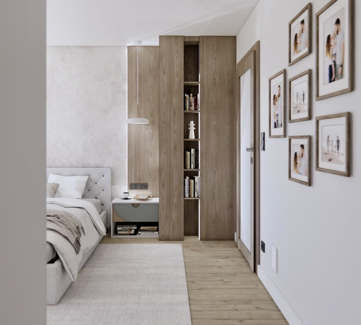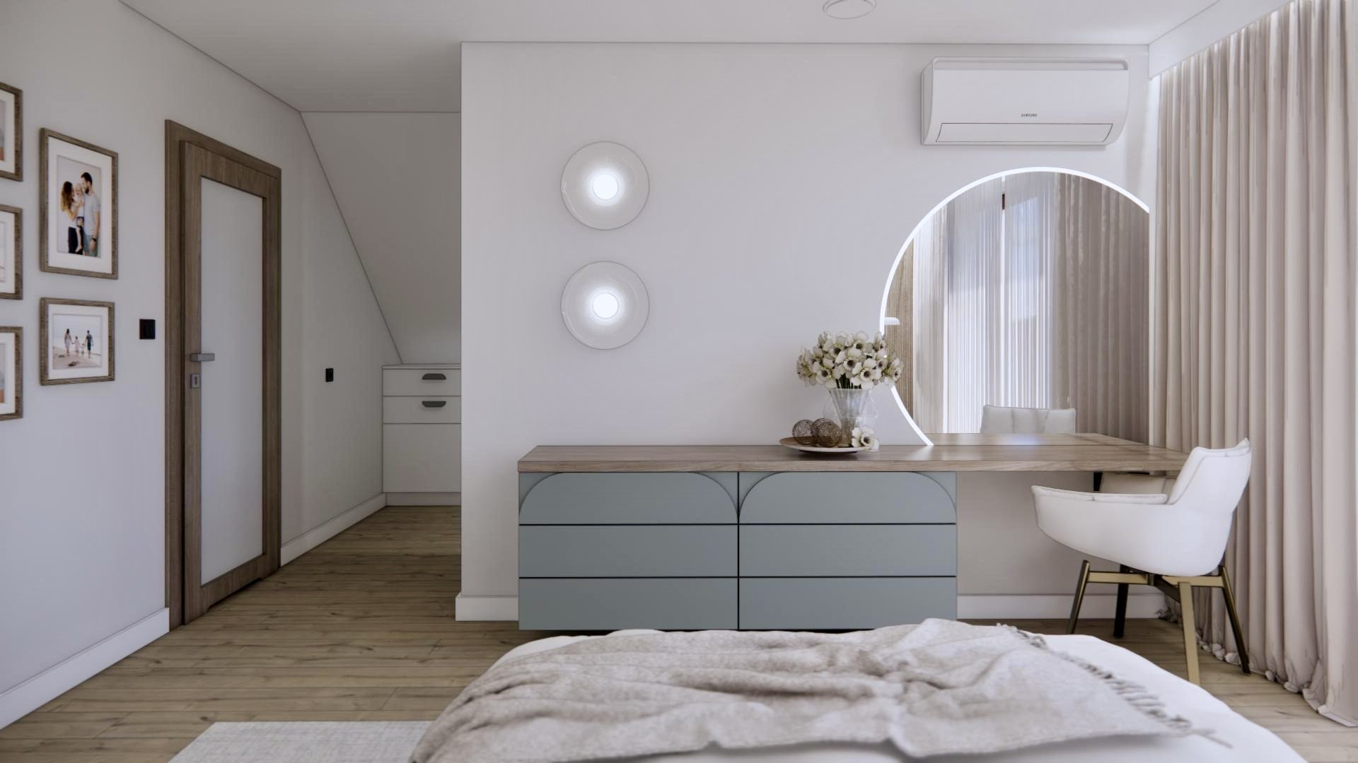 Ciepło do wnętrza wprowadza drewno, równoważąc chłodniejsze barwy i nadając sypialni przytulny, domowy charakter. Całość tworzy spójną, uporządkowaną przestrzeń, sprzyjającą wyciszeniu i regeneracji.