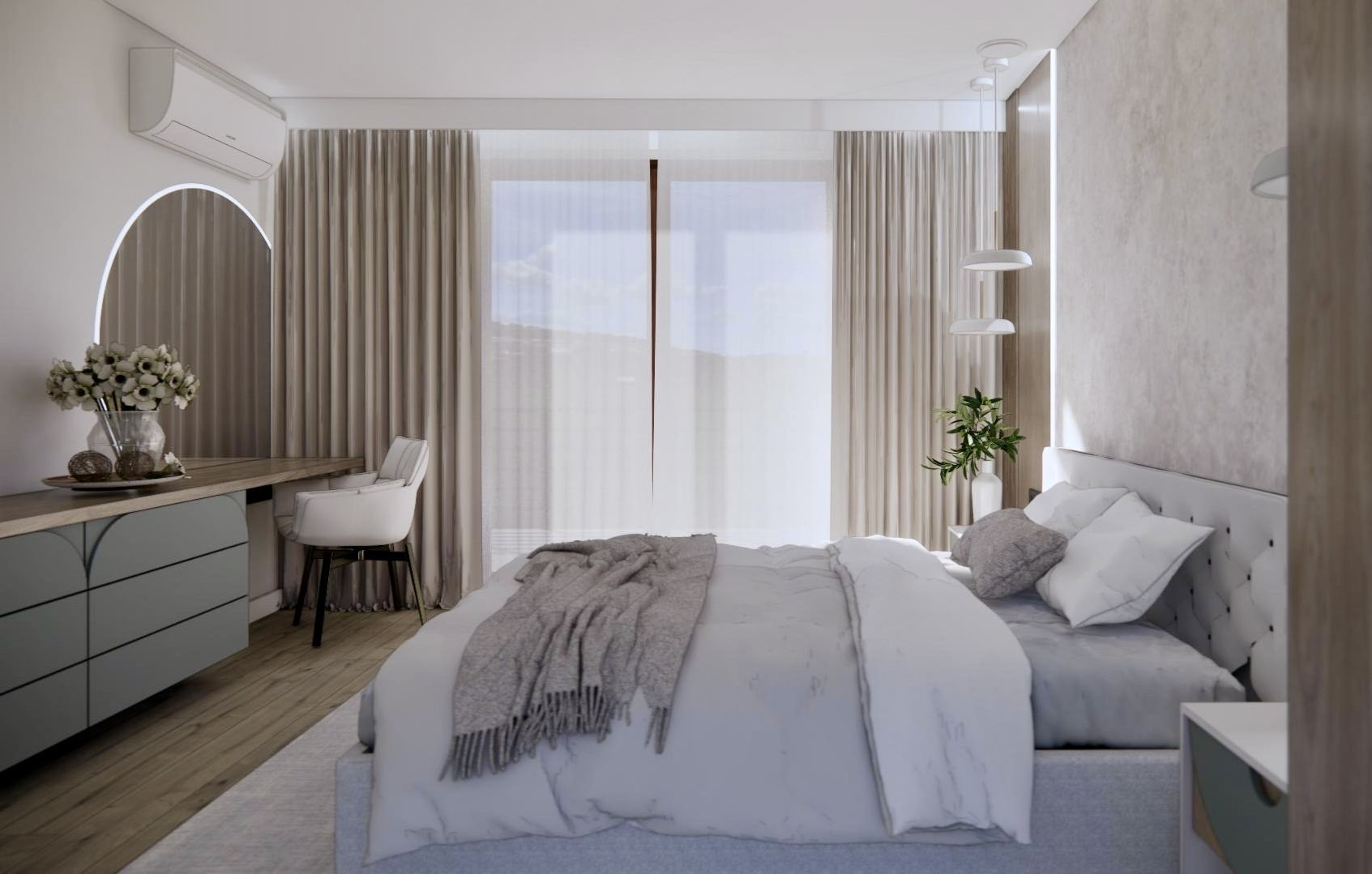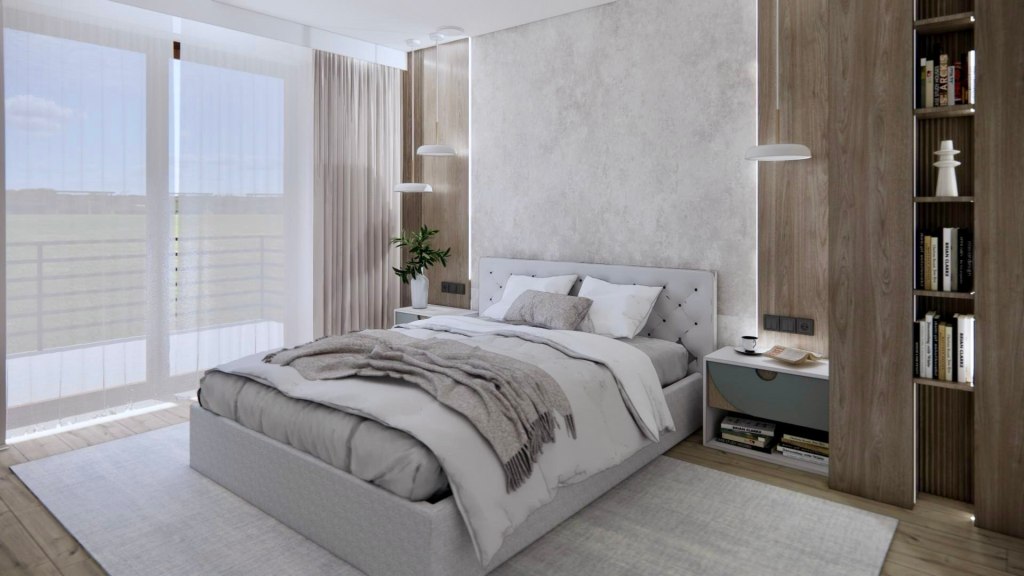 Sypialnia master została zaprojektowana jako spokojna i komfortowa przestrzeń do odpoczynku, połączona bezpośrednio z garderobą oraz łazienką. Centralnym elementem wnętrza jest łóżko z materacem o wymiarach 180×200 cm, z możliwością przyszłej zmiany na większy format 200×200 cm.